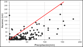 Con la curva ajustada en la Figura 4 se pueden obtener las descargas por flujo subterráneo para cada mes. Si a las recargas totales mensuales se restan estas descargas por flujo se obtienen las descargas por evapotranspiración.