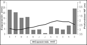 La evaporación aumenta los meses cálidos y a medida que el nivel freático se acerca a la superficie. Aumentando de forma importante en los meses de mayores temperaturas cuando el nivel freático se encuentra a profundidades menores de los 2.50 metros.