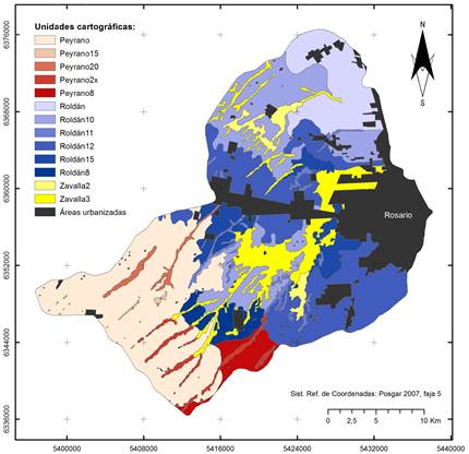 - Etapa 1: se identificaron las unidades cartográficas (UC) obtenidas del agrupamiento de suelos a escala 1:50.000 para la provincia de Santa Fe, digitalizadas y publicadas por la Infraestructura de Datos Espaciales (IDE) del Instituto Nacional de Tecnología Agropecuaria (INTA), Argentina (Nodo EEA Rafaela, S.F.). Las UC presentes en este sistema están definidas por Asociaciones y Consociaciones de suelos a nivel de serie, clasificados según el Sistema Soil Taxonomy (Soil Survey Staff, 1998). Las UC fueron obtenidas a partir de digitalización mediante escáner, georreferenciación a coordenadas globales y proyección, y posterior vectorización en pantalla de las unidades cartográficas que se corresponden con la cuenca del arroyo Ludueña, obrantes en la Carta de Suelos de la Rep. Argentina, en la Hoja 3360-14 (INTA, 1988). El software empleado fue QGIS 2.18.