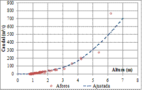 Respecto al régimen de caudales se verifican máximos superiores a 700 m3/s en crecidas extraordinarias. No obstante, la curva de duración de caudales medios diarios corresponde a un régimen de crecidas de corta duración y esporádicas, con caudales superiores a los 200 m3/s en no más del 1% de los días del año; también indica caudales superiores a 40 m3/s en no más del 5% de los días del año. Esta característica observada del régimen de caudales hace factible la simulación por eventos en la cuenca.