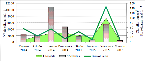 La clorofila a en la estación E1 presentó el mínimo valor en el verano de 2016 coincidiendo con el menor número de células y el menor valor de biovolumen. El máximo valor de clorofila se registró en la primavera de 2015 donde también se registró el máximo valor de biovolumen.