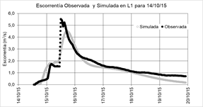 Figuras 33 y 34:De izquierda a derecha, comparación de la escorrentía observada y simulada para las estaciones limnigráfica L1 y L2 para la tormenta del 14/10/15.