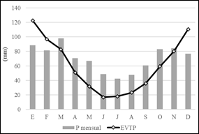 La Figura 5 compara las precipitaciones medias mensuales del período 1900-2016 con las precipitaciones mensuales y la evapotranspiración potencial para el lapso anual de la investigación.