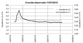 Se verifica una gran variación del volumen de escorrentía en función del estado inicial de humedad de la cuenca. Por ejemplo, en la tormenta del 30/07/15 se produjo una cantidad de agua caída mayor que la del 19/10/15 (Tabla 2). Sin embargo, el volumen de escorrentía es menor en la tormenta del 30/07/15 que en la del 19/10/15. La explicación se encuentra en el efecto residual de lluvias producidas con anterioridad a cada evento y el intervalo entre los eventos en consideración. Precisamente la tormenta del 19/10/15 viene precedida de otras dos tormentas con un intervalo menor a 20 días, y la curva de recesión aún no había llegado a su valor mínimo cuando se produjo una nueva precipitación.