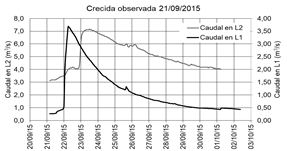 Figuras 29 y 30:De izquierda a derecha, comparación de la escorrentía observada y simulada para las estaciones limnigráfica L1 y L2 para la tormenta del 21/09/15.