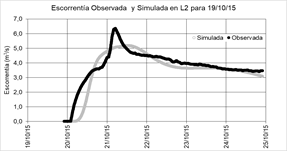 Figuras 35 y 36:De izquierda a derecha, comparación de la escorrentía observada y simulada para las estaciones limnigráfica L1 y L2 para la tormenta del 19/10/15.
