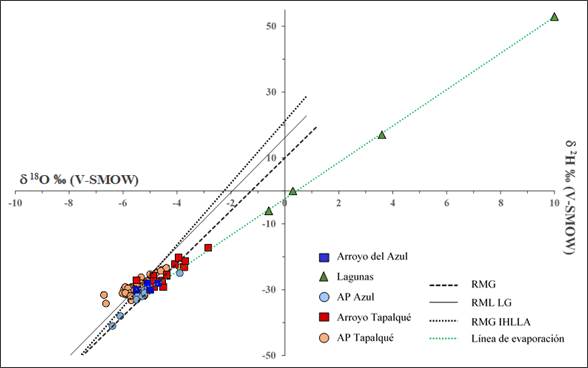Las rectas meteóricas locales (RML) utilizadas en este trabajo son las publicadas por Zabala et al. (2021). Dichas rectas se calcularon a partir de los análisis isotópicos efectuados sobre las muestras de agua de lluvia de los dos colectores mencionados anteriormente: Establecimiento La Germania (LG) en cuenca alta e Instituto de Hidrología de Llanuras (ciudad de Azul, IHLLA), en cuenca media. Las ecuaciones resultantes fueron las siguientes: δ2H = 8.3(± 0.5)δ18O + 16.2(± 3.0) para el colector de La Germania (RML LG) y δ2H = 9.4(± 0.4)δ18O + 21.2(±2.3) para el colector del IHLLA (RML IHLLA). Se considerará, a los fines de este trabajo, dado que no hay publicados datos isotópicos del agua de lluvia de la cuenca del arroyo Tapalqué, que las características isotópicas de las lluvias de la cuenca del arroyo del Azul son representativas de las lluvias de la región.